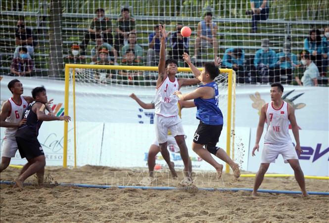 Vietnam (white) won 2-0 over Singapore (black) in the men's beach handball match at SEA Games 31 which took place at the beach of Tuan Chau Island on the southwest side of Ha Long City, Quang Ninh province on May 9 afternoon. This is the fourth victory of Vietnam team. VNA Photo: Quý Trung