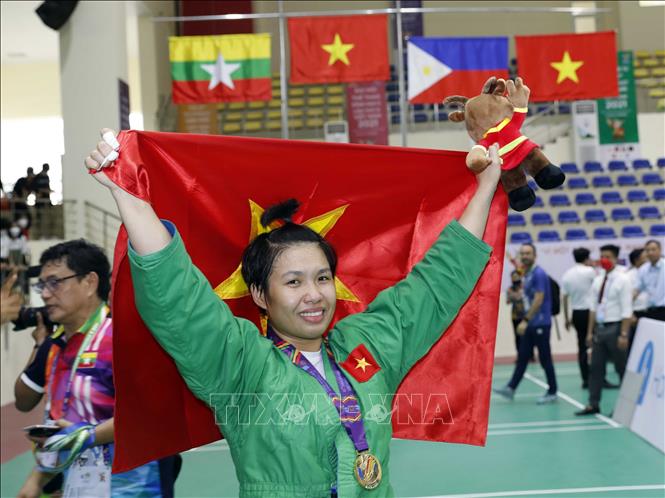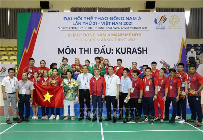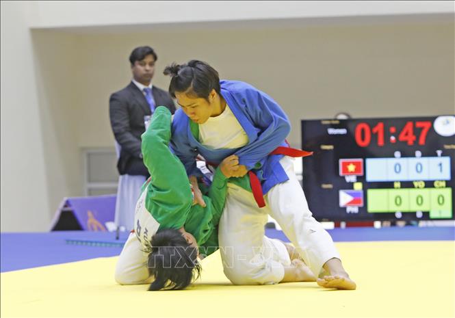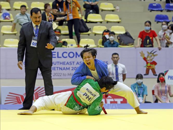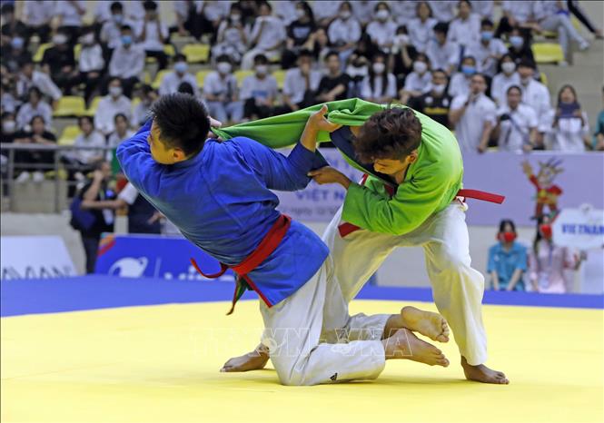 Kurash athletes entered the last day of competitions on May 13 at Hoai Duc Gymnasium in Hanoi. Athletes compete for the gold medals in women’s 57kg, 70kg categories and men’s 73kg category. The Vietnam team earned a total of seven out of 10 gold medals in Kurash tournament, exceeding the original expectation of five medals. VNA Photo: Trần Việt