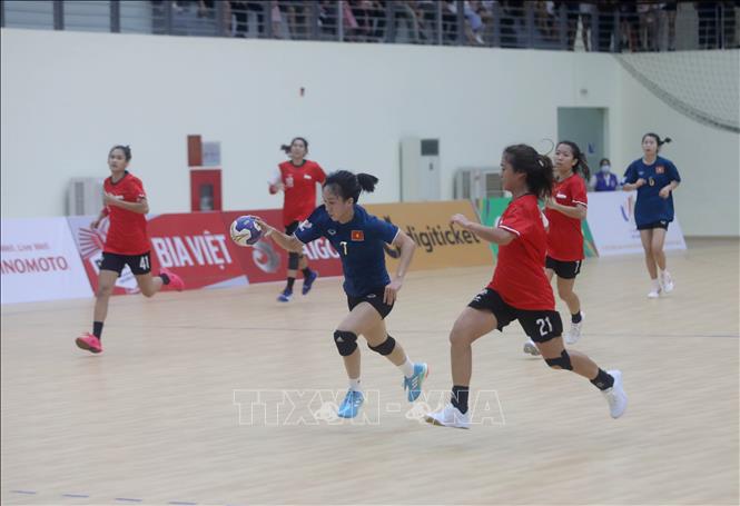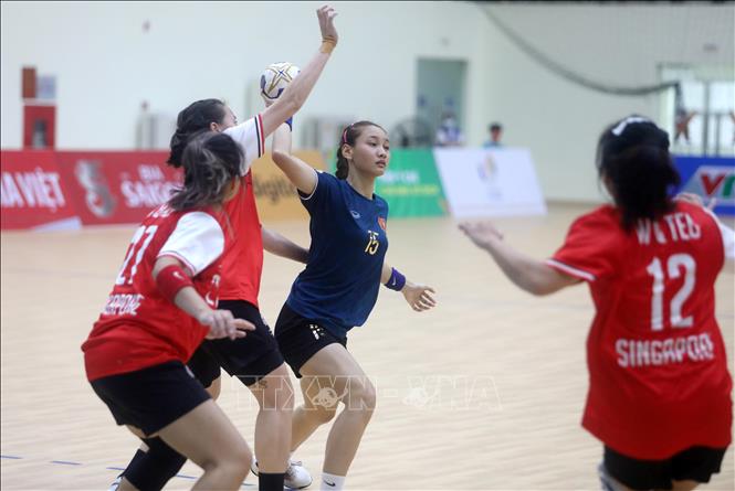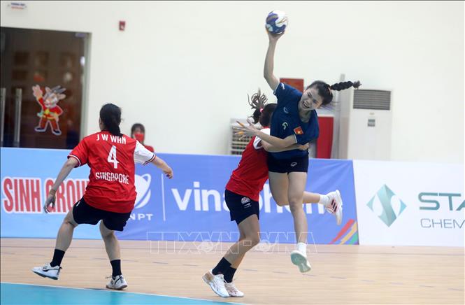 Vietnam (in blue) fetched a 32-17 win over Singapore (in red) in the opening match of the women’s indoor handball event within the 31st Southeast Asian Games (SEA Games 31) at the Bac Ninh University of Physical Education and Sports in the northern province of Bac Ninh on May 15. VNA Photo: Thế Duyệt