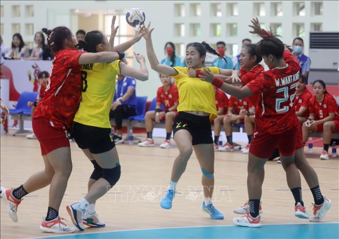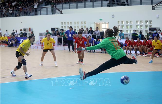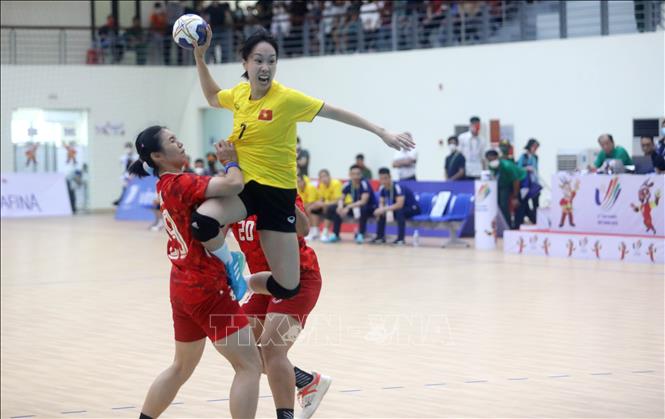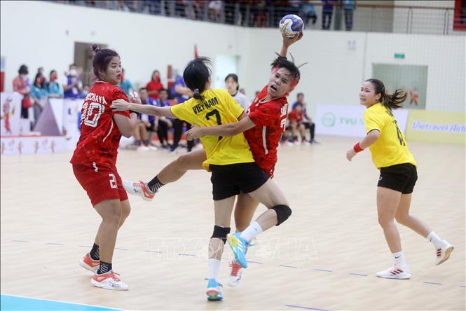 The Vietnamese team (yellow) defeated their Thai rivals (red) 40-30 in the second leg match of the women’s indoor handball at the 31st Southeast Asian Games (SEA Games 31) on May 17. VNA Photo: Thế Duyệt