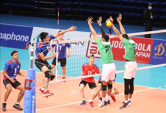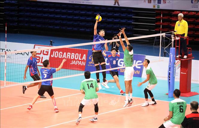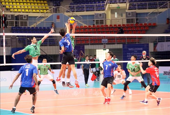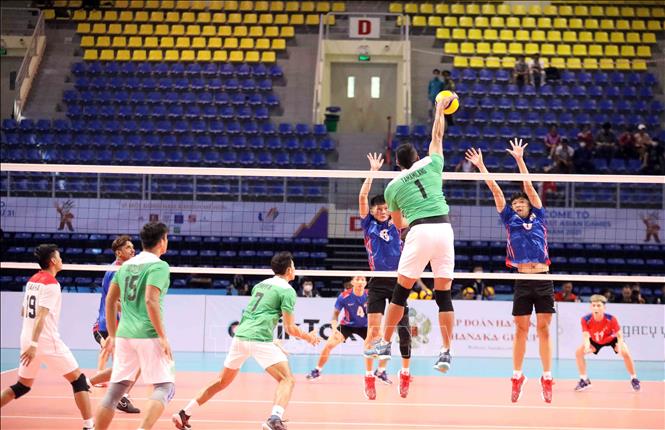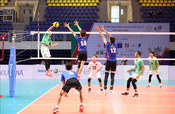 Indonesia (in green) won 3-0 over Malaysia (in blue) in a men’s indoor volleyball match within the SEA Games 31 which took place at the Dai Yen Gymnasium in Ha Long city, the northern province of Quang Ninh, on May 17. VNA Photo: Anh Tuấn