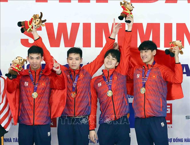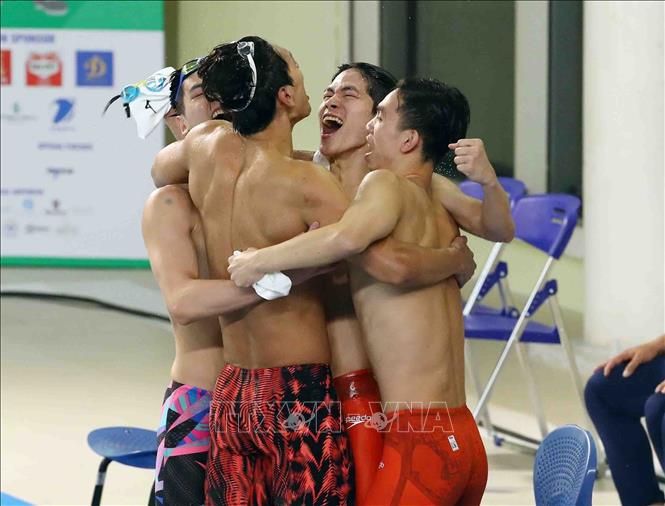 The Vietnamese swimming team set a new record at the 31st Southeast Asian Games (SEA Games 31), with a time of 7 minutes and 16.31 seconds, wining a gold medal in the men's freestyle 4x200m relay event on on May 17, the 4th day of competition. Swimmers Nguyen Huu Kim Son and Nguyen Huy. Hoang, Hoang Quy Phuoc and Tran Hung Nguyen competed with their rivals from Malaysia, Singapore, Thailand, and Indonesia in this event. This is the second time at SEA Games 31, Vietnamese swimmers have defeated Rio 2016 Olympic champion Joseph Schooling of Singapore and his teammates in the relay event. VNA Photo: Phạm Kiên