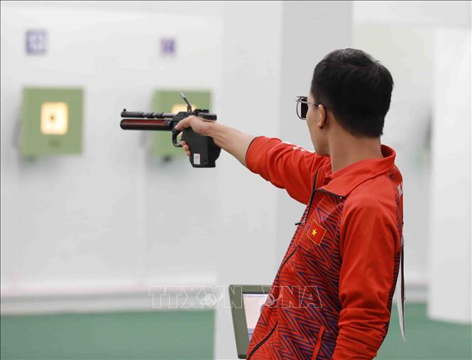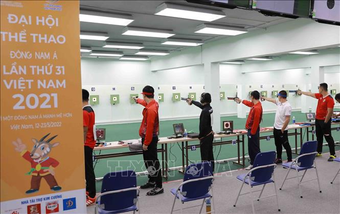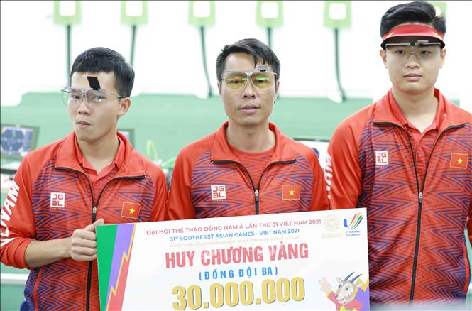 Vietnamese shooters earned two gold and one silver medals on May 19, the fourth competition day of shooting at the ongoing SEA Games 31. The first gold was seized by Tran Quoc Cuong, Phan Cong Minh and Pham Quang Huy, who took the first place in the men's 10m air pistol team event, with 1,713 points. Their Indonesian and Thai opponents obtained the silver and bronze medals with 1,708 and 1,695 points, respectively. Cuong, the most experienced shooter of Vietnam, also brought home a silver medal on the day for his performance in the men’s 10m air pistol, with Wong Guanjie Johnathan of Malaysia bagging gold and Prabowo Muhammad Iqbal Raia of Indonesia securing the bronze medal. The Vietnamese shooting squad has so far earned four gold and three silver medals, ranking just behind Indonesia in the tally. VNA Photo: Vũ Sinh