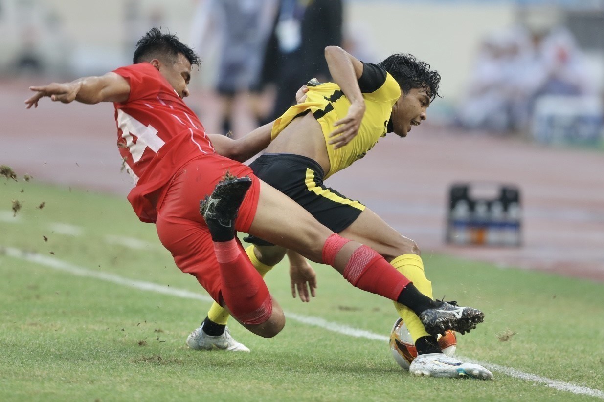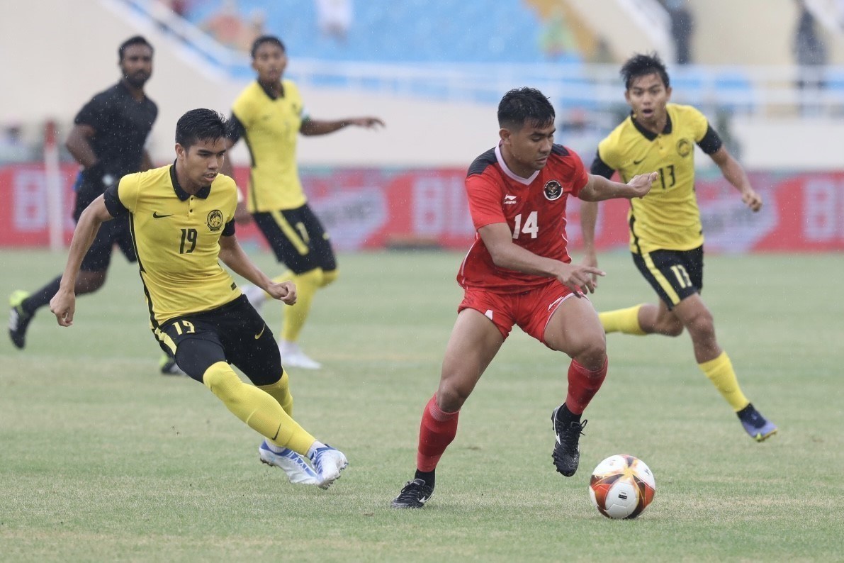 After 90 minutes ending at 1-1, U23 Indonesia (in red) won 4-3 over U23 Malaysia (in yellow) in penalty shoot-outs in the third-place match of the SEA Games 31 men’s football at the My Dinh stadium in Hanoi on May 22 and took the bronze. VNA Photo