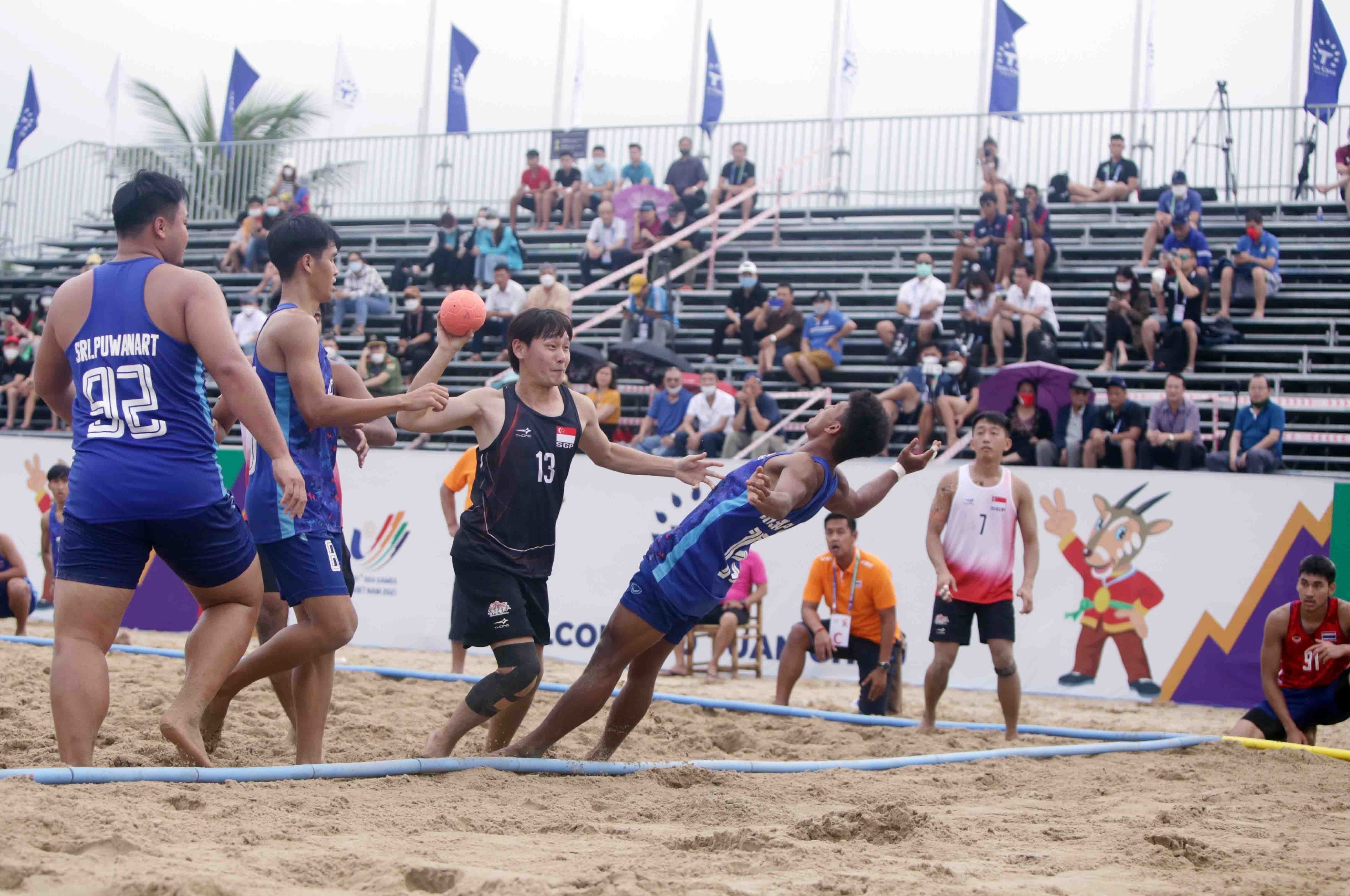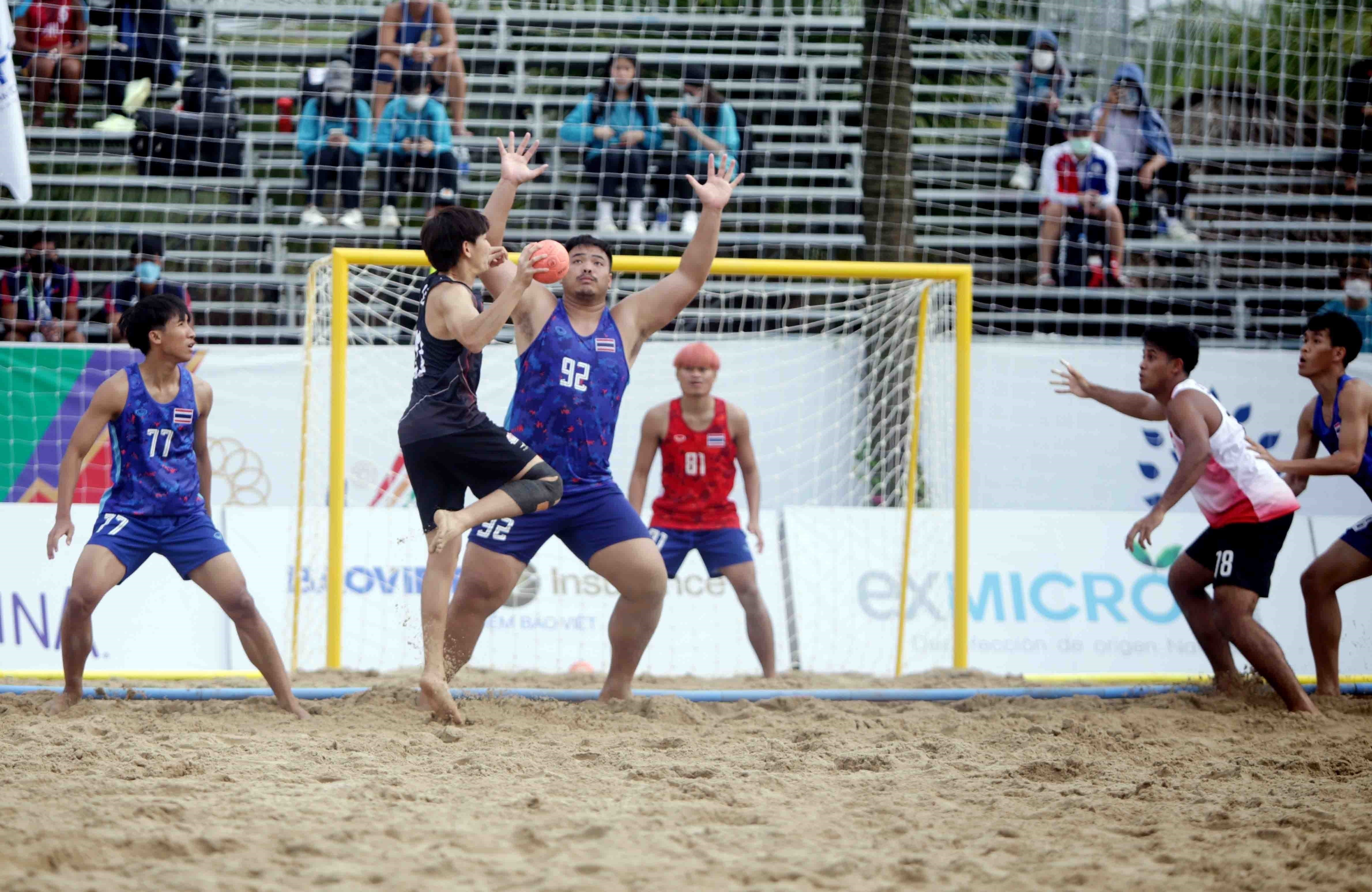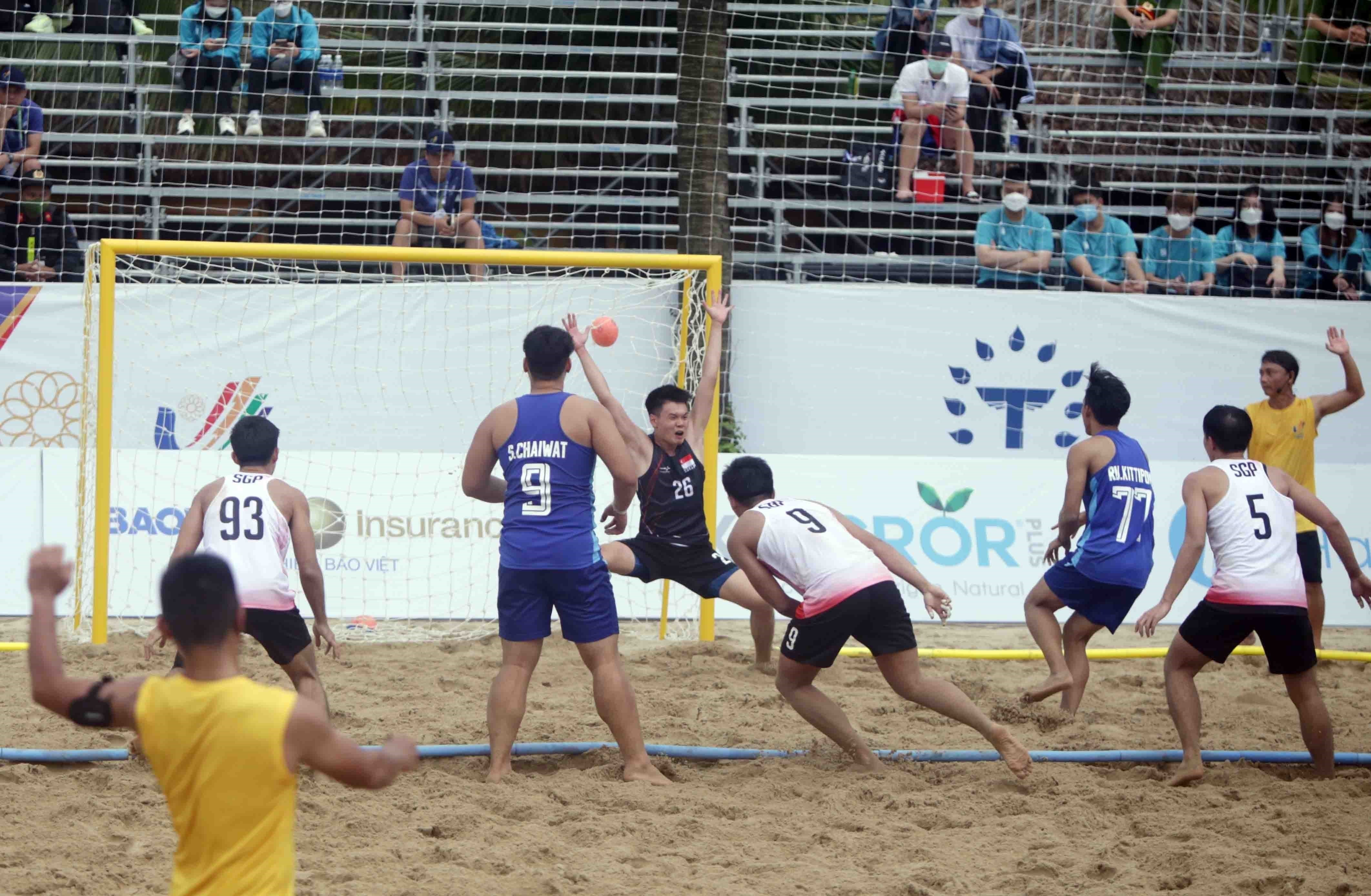 Thailand (blue and red) won 2-0 over Singapore (black and white) in the men's beach handball at SEA Games 31 which took place at the beach of Tuan Chau Island on the southwest side of Ha Long City, Quang Ninh province on May 10 afternoon. VNA Photo: Quý Trung