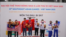 Pétanque Athletics Vovinam Triathlon and Duathlon Jujitsu Kurash Kickboxing Finswimming Esports Bowling Bodybuilding Wushu Wrestling Weightlifting Volleyball Tennis Taekwondo Table Tennis Shooting Sepak Takraw Boat racing Pencak Silat Muay Karate Judo Handball Gymnastics Golf Fencing Dancesport Cycling Chess Boxing Billiard Snooker Basketball Badminton Archery Diving Swimming Football SEA Games 31: Vietnam bag first gold in pétanque Sunday, May 15, 2022 20:58 SEA Games 31: Pétanque athletes kick off competition Friday, May 13, 2022 11:02