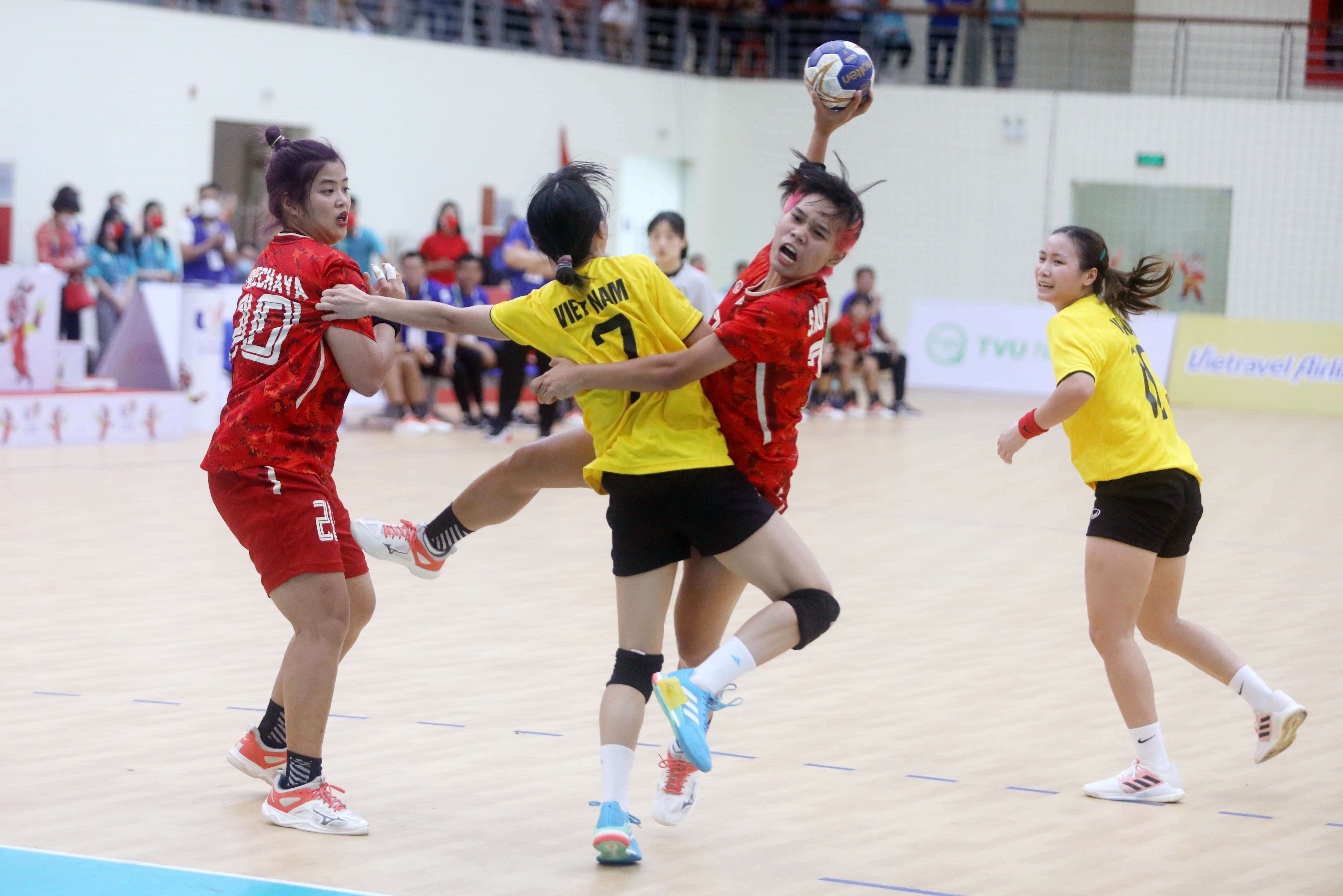 The Vietnamese team (yellow) defeated their Thai rivals (red) 40-30 in the second leg match of the women’s indoor handball at the 31st Southeast Asian Games (SEA Games 31) on May 17. VNA Photo: Thế Duyệt