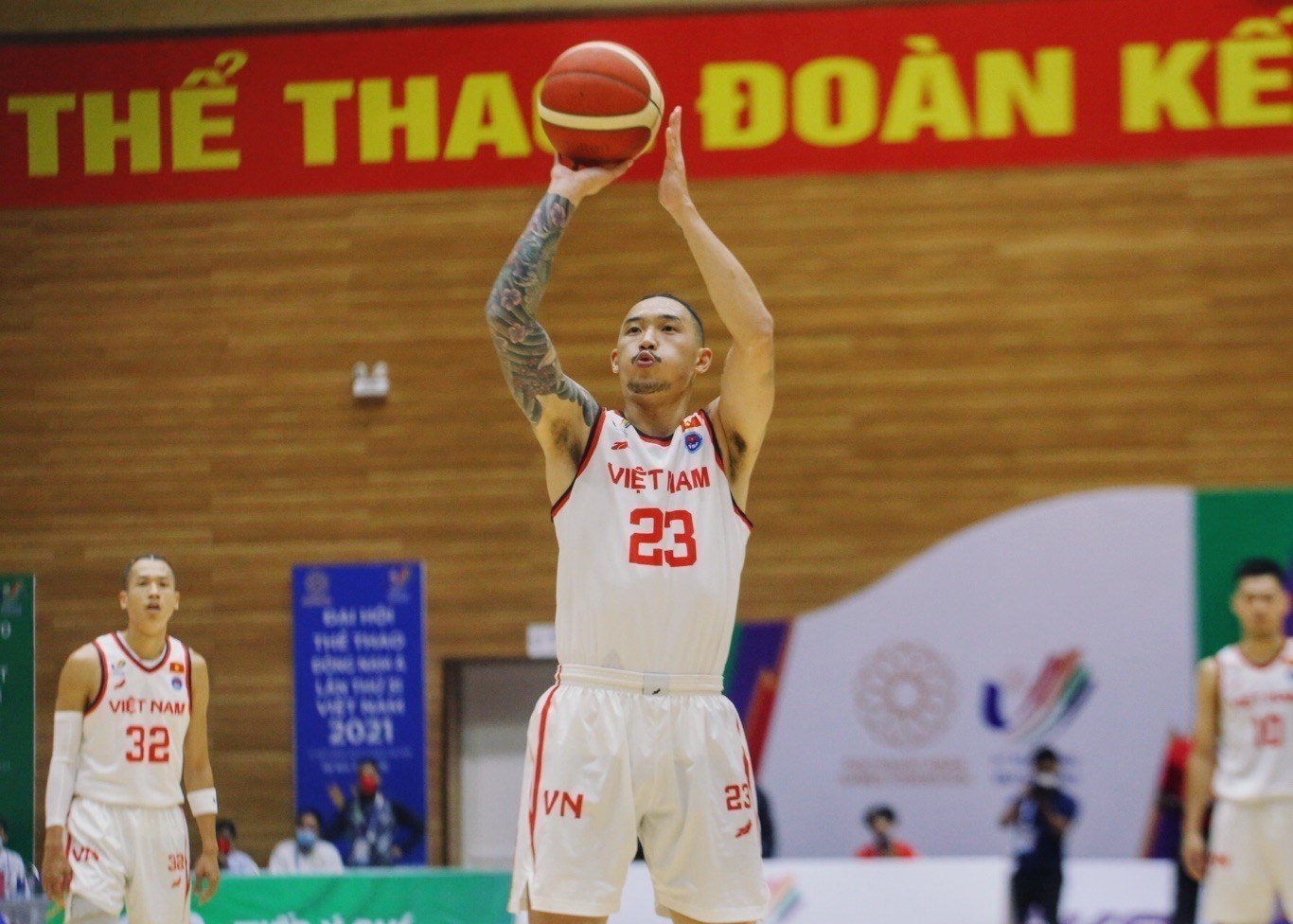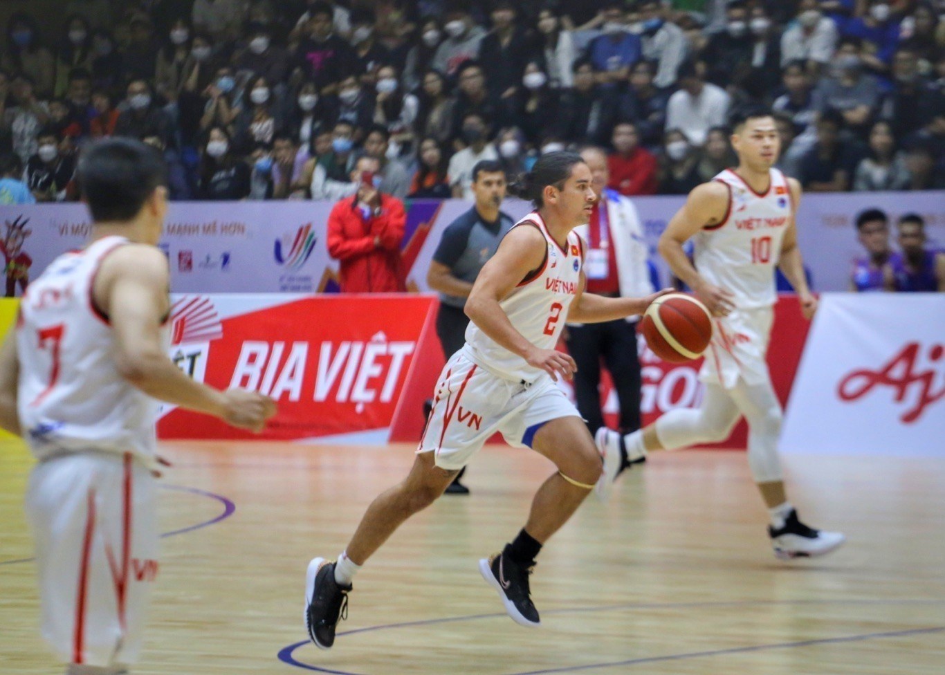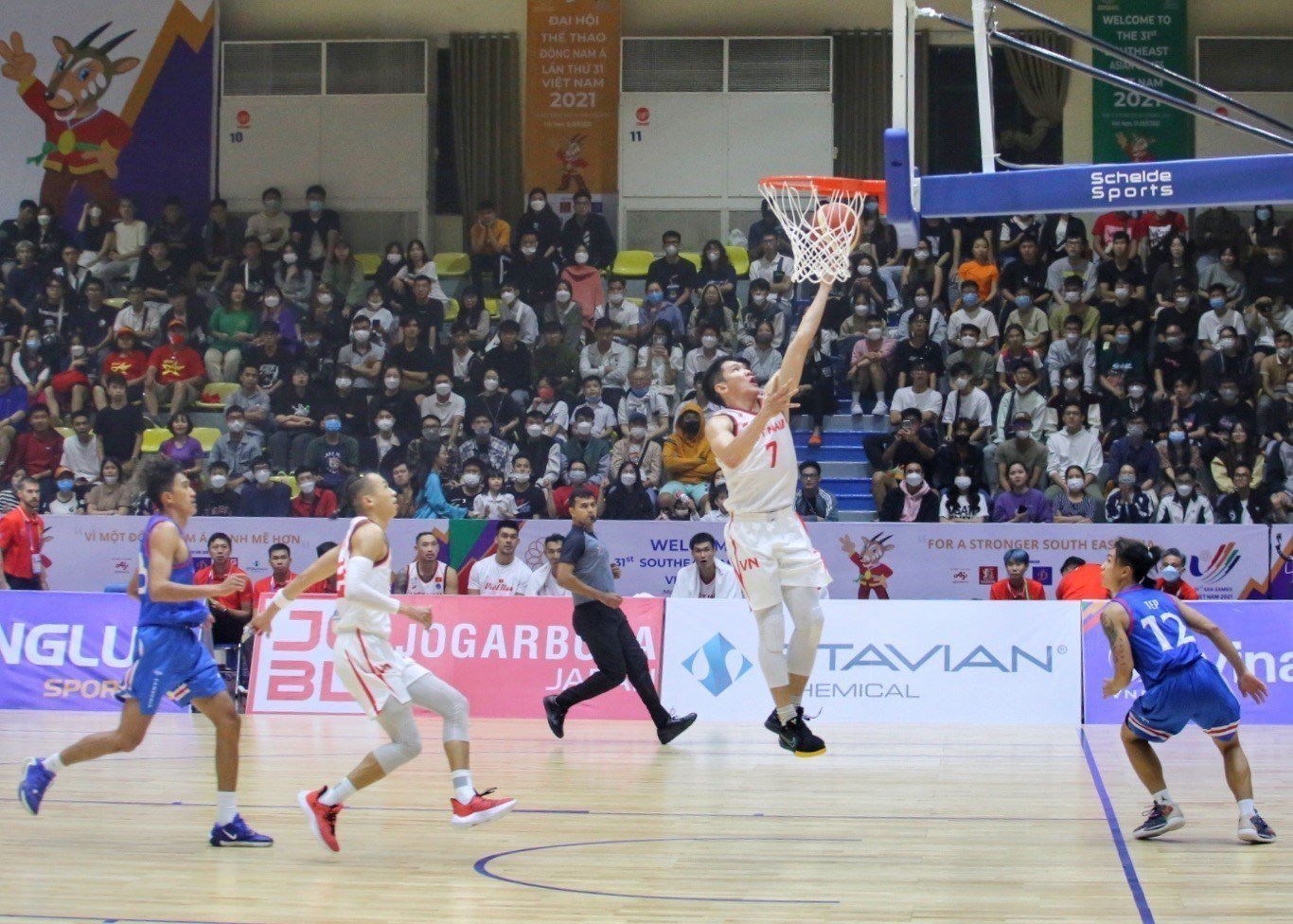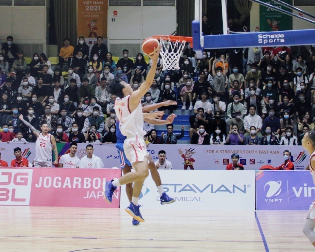 Right after a win of the Vietnamese female team over Singapore in basketball 5x5 in SEA Games 31, Vietnamese male basketballers (in white) defeated their Cambodian rivals (in blue) in their opener with a score of 87-55 at the Thanh Tri Gymnasium, Hanoi, on May 16. The men’s basketball 5x5 competitions kicked off on the day with the participation of seven teams, including Indonesia, Malaysia, Singapore, Thailand and the Philippines. VNA Photo: Tuấn Đức