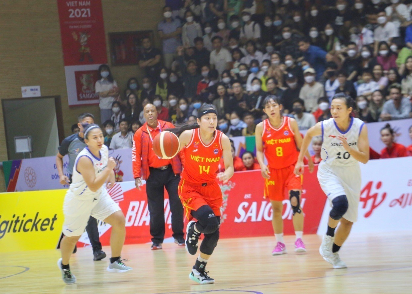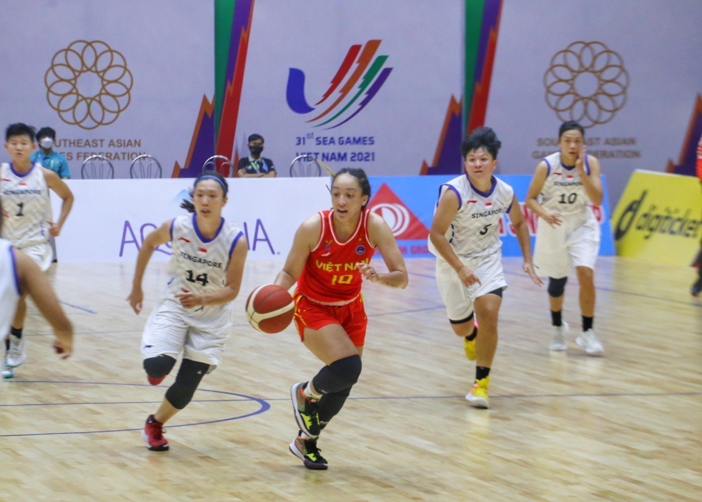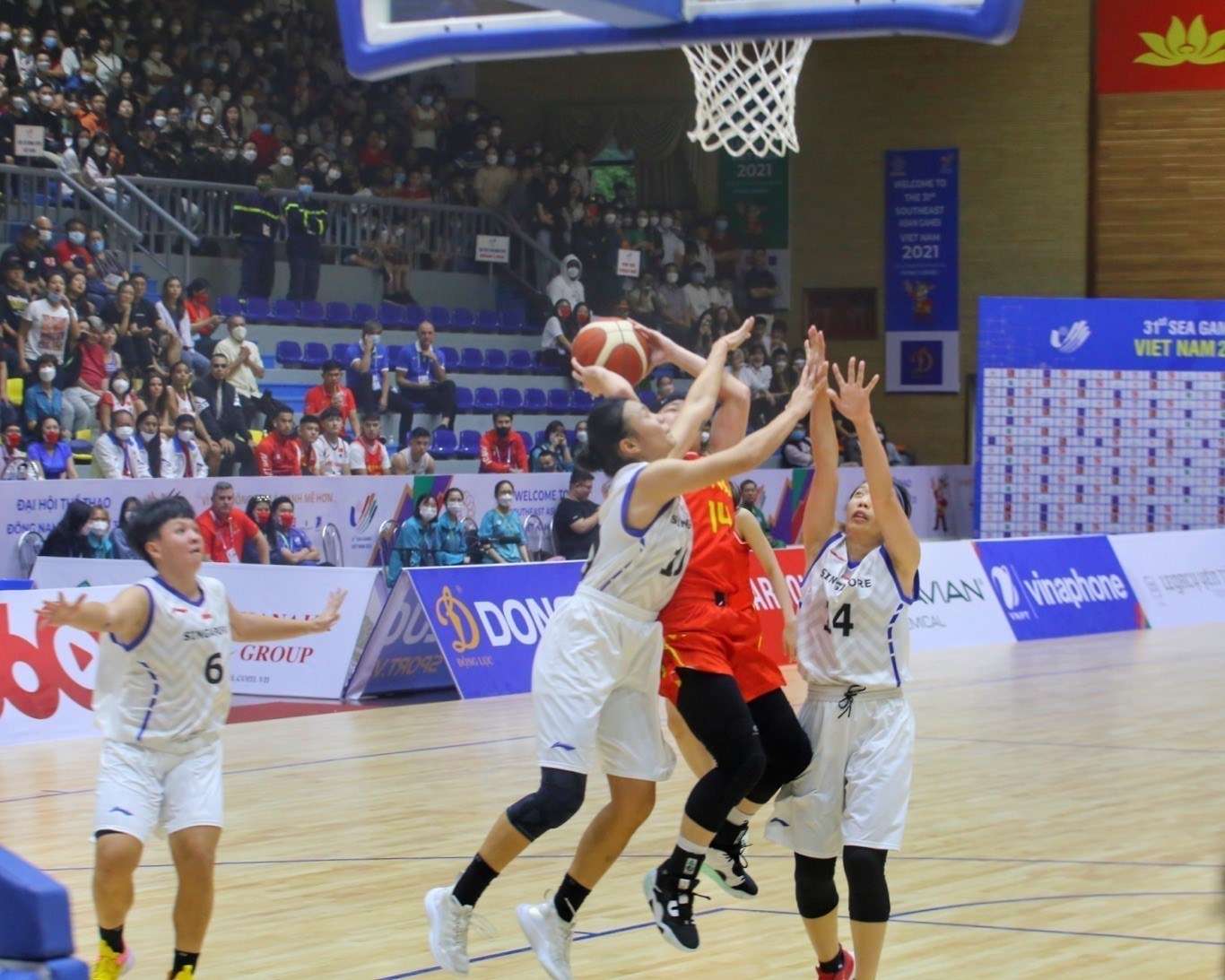Vietnamese female basketballers (in red) got the first win in their SEA Games 31 opener after defeating Singaporean rivals (in white) 73-51 in a qualifying match in the women’s basketball 5x5 at the Thanh Tri Gymnasium, Hanoi, on May 16. The women’s basketball 5x5 competitions kicked off on the day with the participation of six teams, including Indonesia, Malaysia, Thailand and the Philippines. VNA Photo: Tuấn Đức
