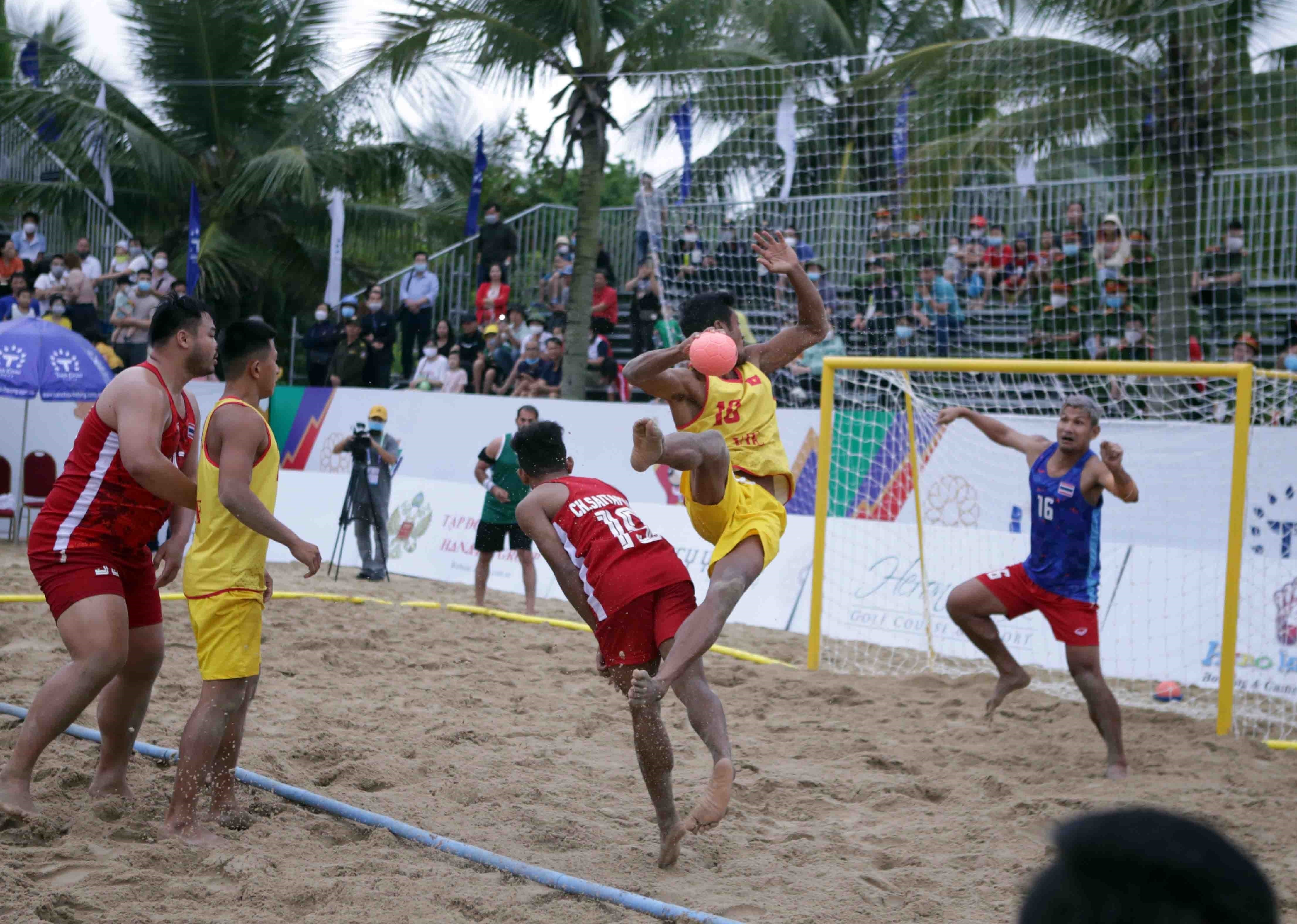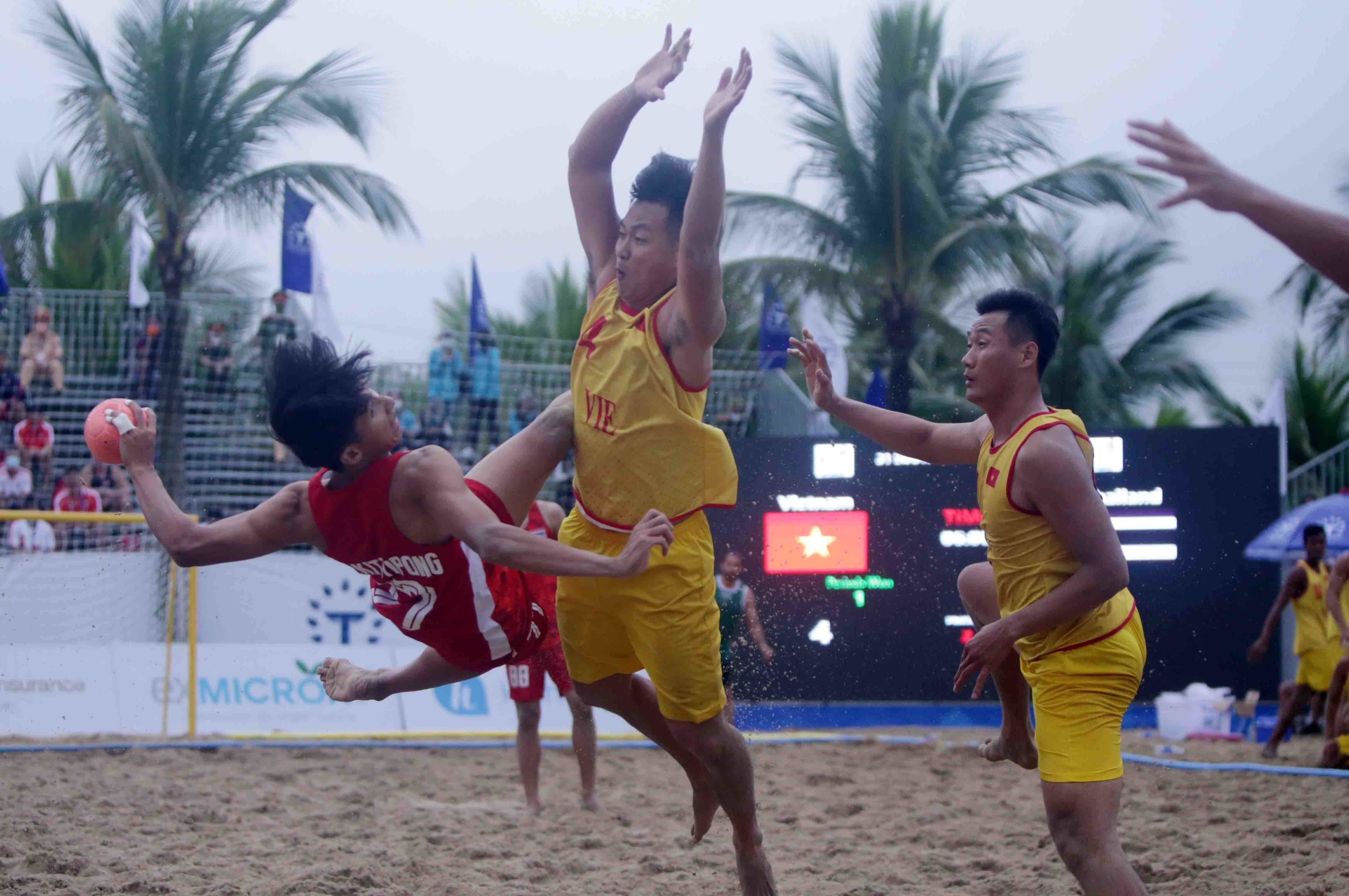 Vietnam (yellow) won 2-1 over Thaland (red) in the men's beach handball match at SEA Games 31 which took place at the beach of Tuan Chau Island on the southwest side of Ha Long City, Quang Ninh province on May 8 afternoon. VNA Photo: Quý Trung