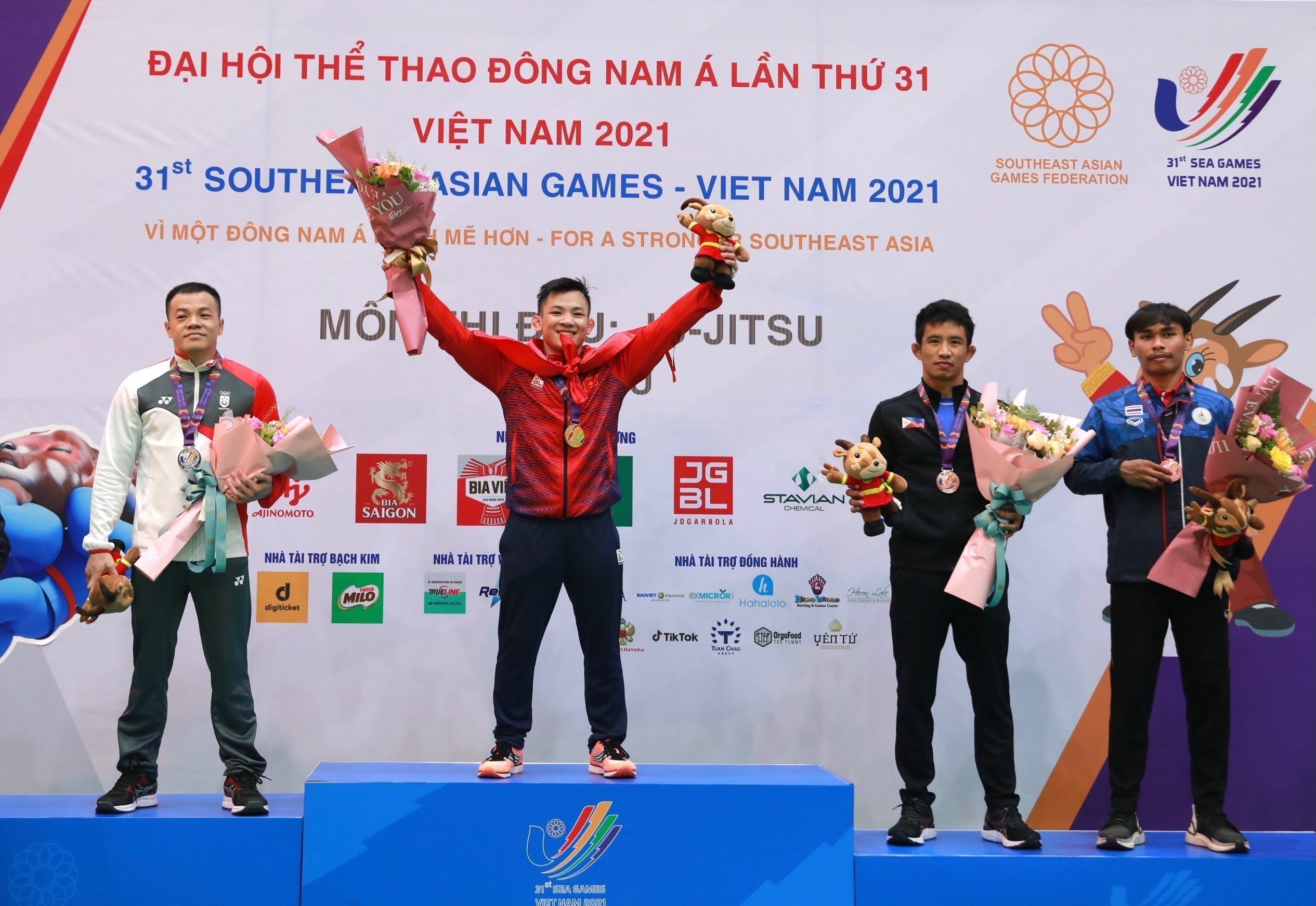 Vietnam's Jujitsu artists Phung Thi Hue and Dao Hong Son brought home two more gold medals on May 15 as the 31st Southeast Asian Games (SEA Games 31) carried on. Hue championed the women’s Ne-Waza NOGI 45kg after defeating her Philippine opponent Co Jollirine who was awarded a silver medal. Dao Hong Son beated Tang Yong Siang from Singapore to secure the first spot in the men’s Ne-Waza NOGI 56kg. VNA Photo: Hoàng Hiếu
