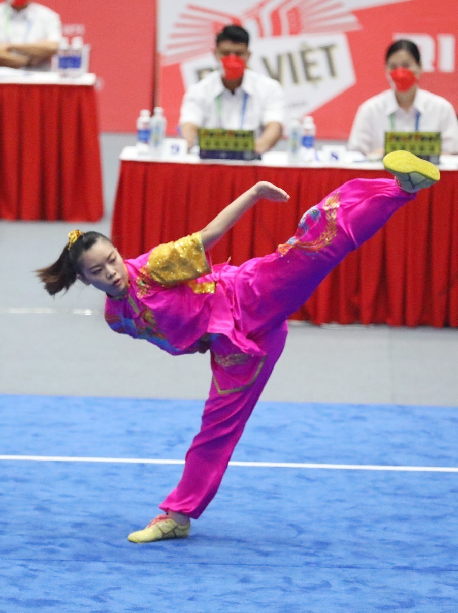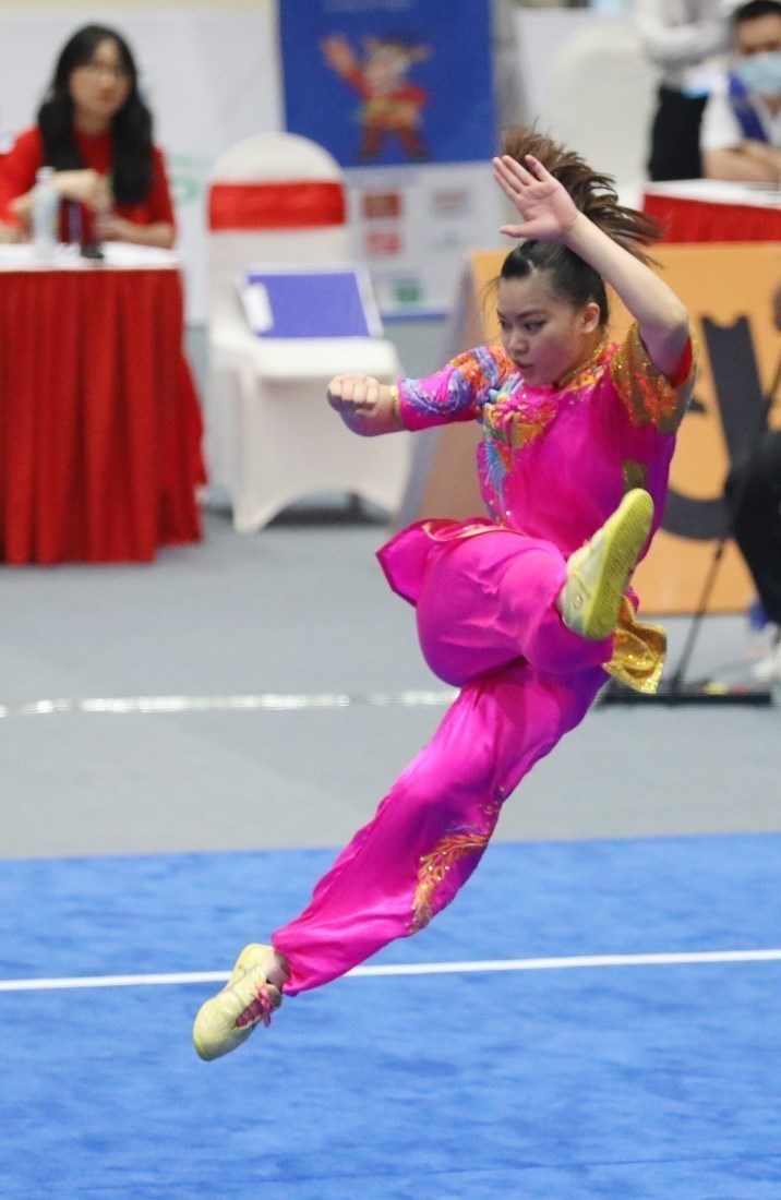 Vietnamese wushu athlete Hoang Thi Phuong Giang won a gold medal on May 15, the last competition day of the sport at SEA Games 31. With 9.71 points, Giang brought home the gold medal in the women’s Changquan category. Her teammate, Duong Thuy Vi also bagged a bronze medal in the event. VNA Photo: Phạm Hậu